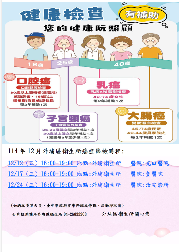 114年12月外埔區衛生所癌症篩檢時程: