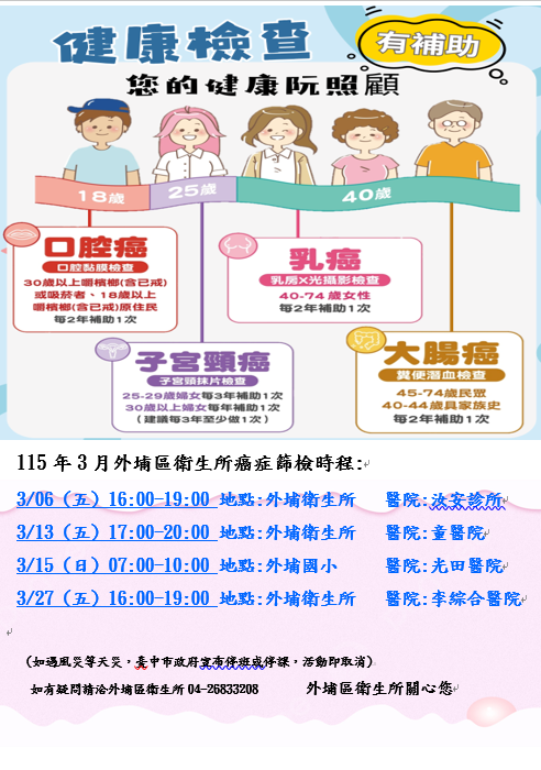 115年3月外埔區衛生所癌症篩檢時程: